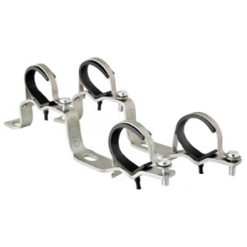 Кронштейны для крепления пары (подающий и обратный) коллекторов к несущей конструкции (стене или коллекторному шкафу). Состоят из крепежной планки, выполненной из стальной анодированной полосы толщиной 3 мм, к которой винтами крепятся два стальных никелированных хомута толщиной 1 мм. В хомуты вставлены прокладки из пластика, служащие тепло- и виброзащитой и предохраняющие коллекторы от механических повреждений. Кронштейны обеспечивают разнос коллекторов по высоте на 115 мм (между осями) и на 32 мм по глубине.